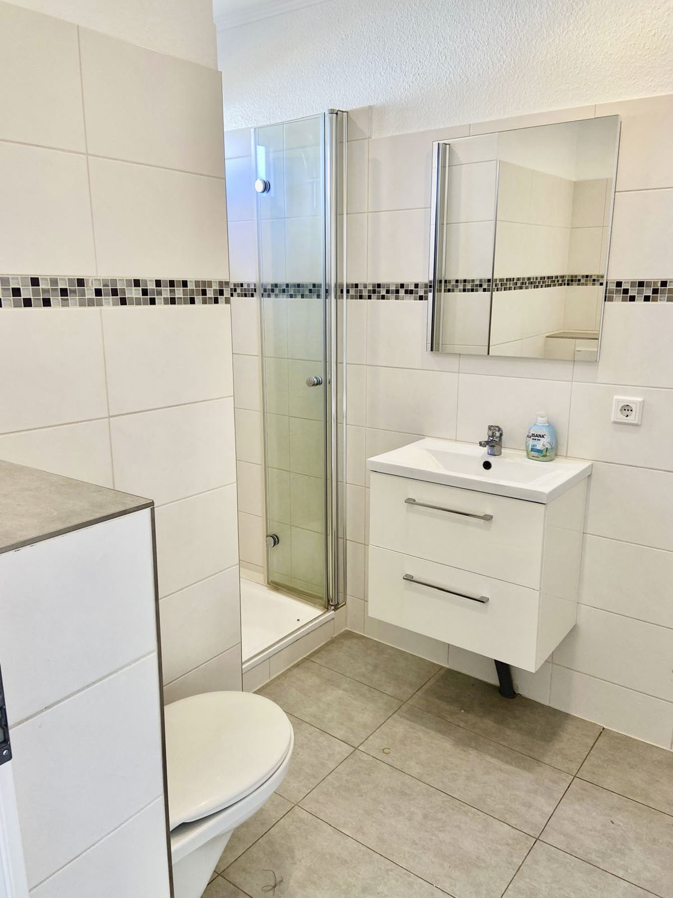 Das moderne Duschbad ist mit zeitlos hellen Fliesen gestaltet und bietet eine angenehme, klare Optik sowie alle notwendigen Sanitäreinrichtungen für den täglichen Komfort.