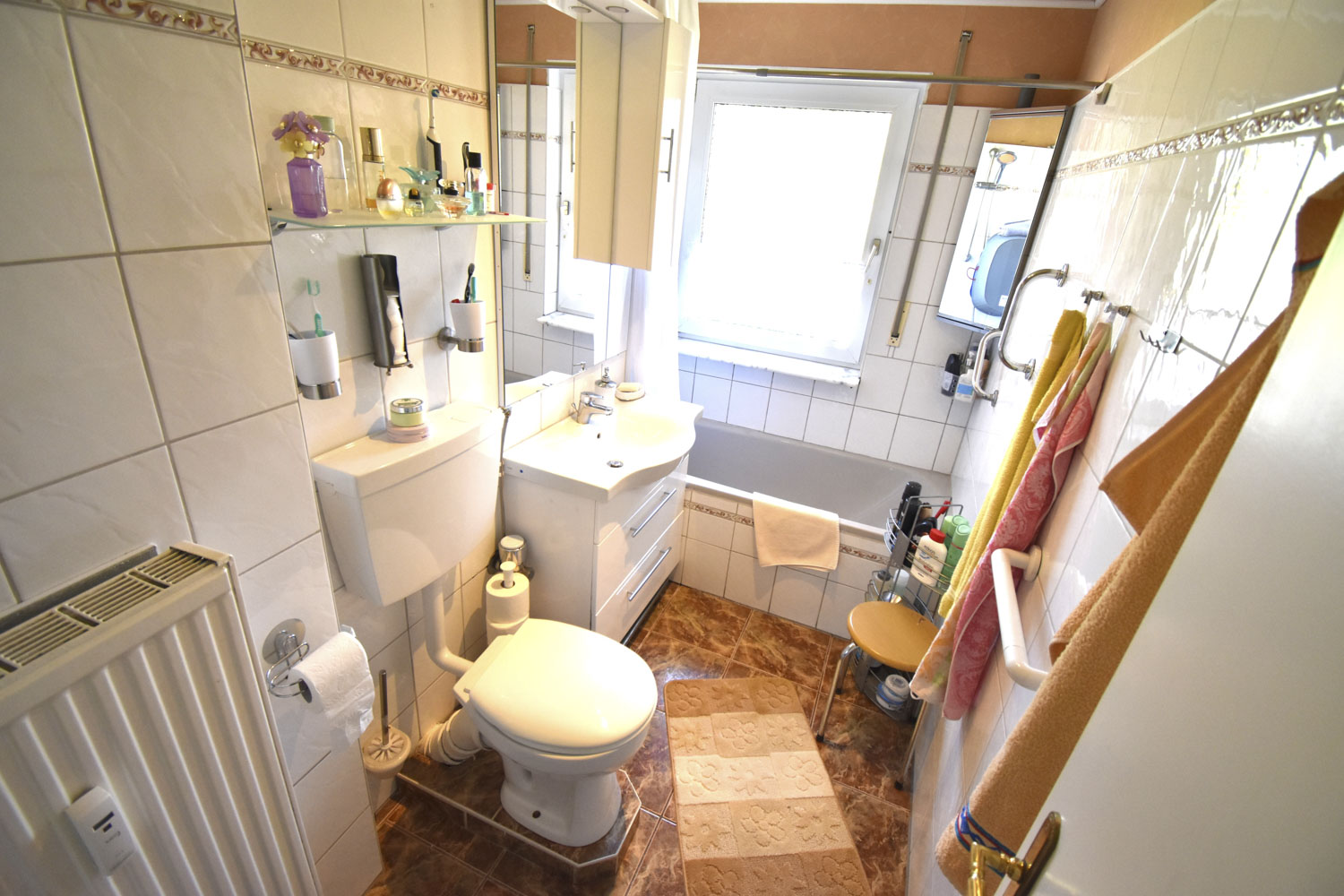 Das Badezimmer wurde hell gefliest und ist mit einer Badewanne ausgestattet. Die Wohnräume sind mit hellem Laminatboden versehen, Küche und Bad mit zeitlosen Fliesen – das Gesamtbild ist gepflegt, freundlich und harmonisch.