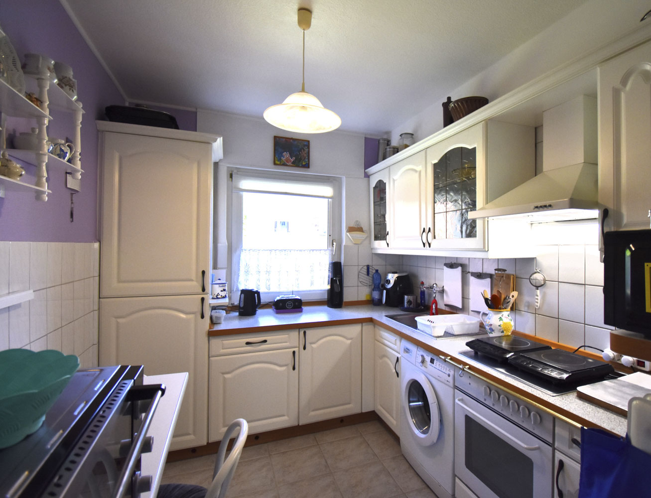 Das Wohnzimmer ist der zentrale Treffpunkt der Wohnung und bietet durch den Zugang zum Balkon zusätzlichen Raum für entspannte Stunden an der frischen Luft. Die Küche ist mit einer hochwertigen, hellen Einbauküche ausgestattet und bietet ausreichend Platz zum Kochen und Verstauen.